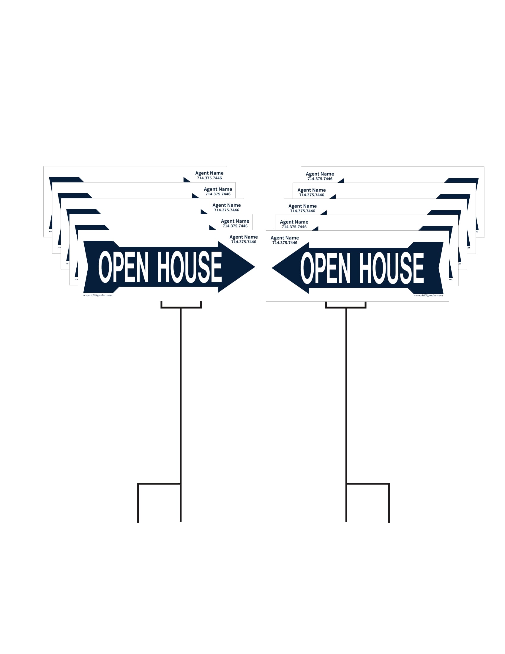 This is our best selling open house sign package! Includes ten 9x24" 6mm Coroplast Open House Signs with ten stakes.