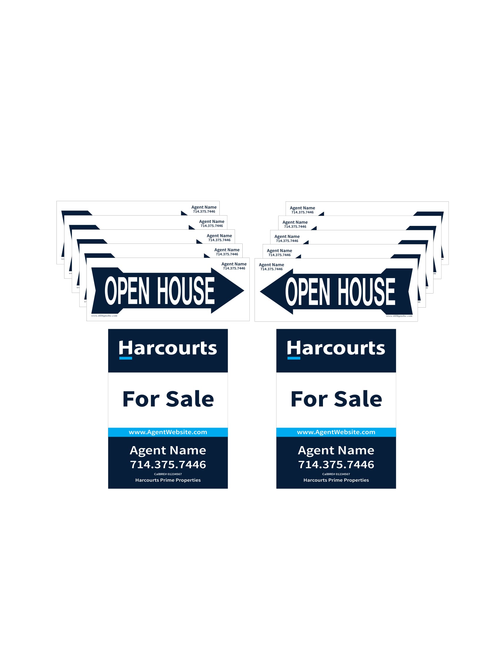 Ideal for a new realtor! 2 18x24" PVC or Polystyrene Listing Signs, drilled to your specifications. 10 9x24" 6mm Coroplast Open House Signs with ten stakes.