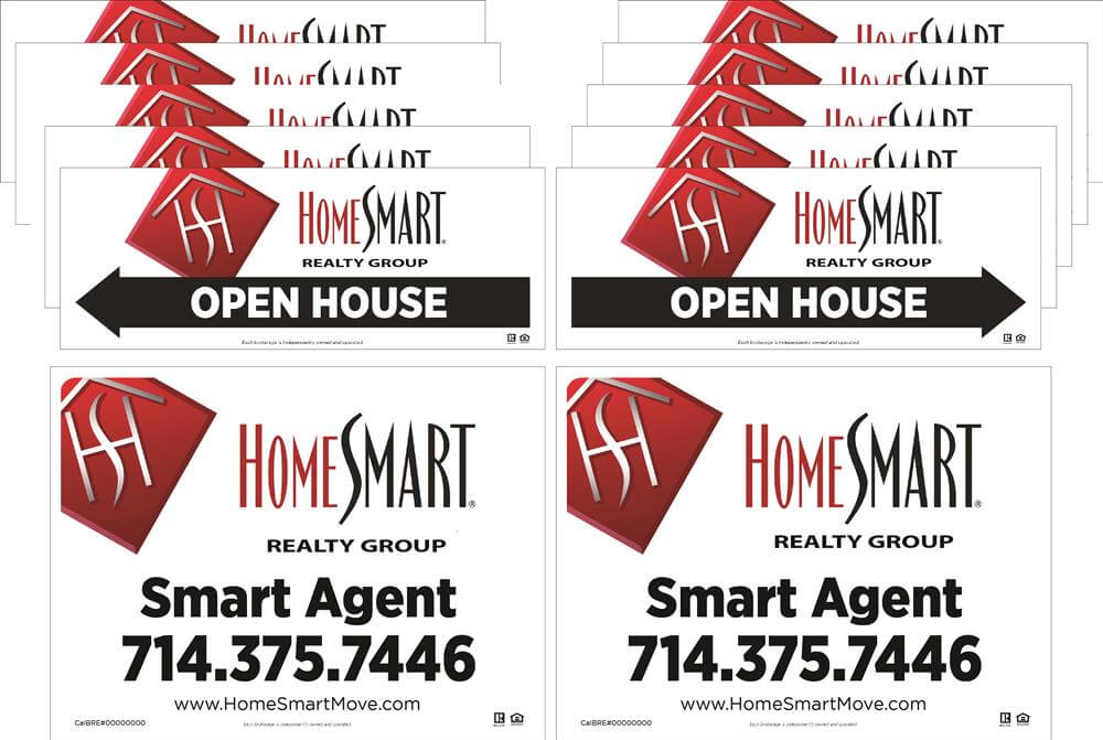 Ideal for a new realtor! 2 18x24" PVC or Polystyrene Listing Signs, drilled to your specifications. 10 9x24" 6mm Coroplast Open House Signs with ten stakes.