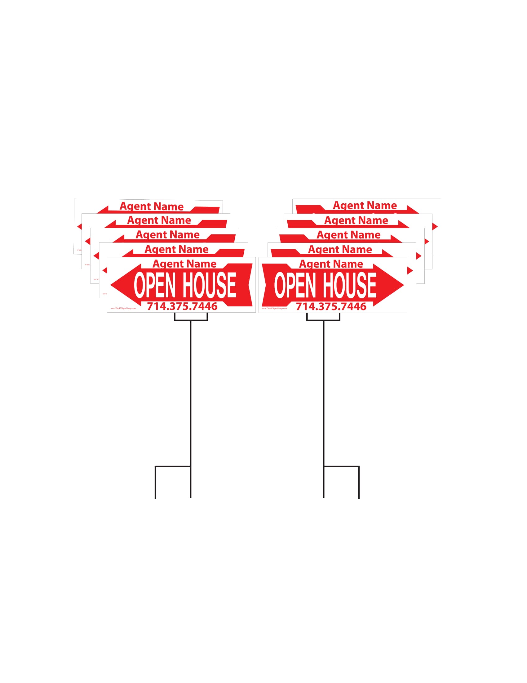 This is our best selling open house sign package! Includes ten 9x24" 6mm Coroplast Open House Signs with ten stakes.