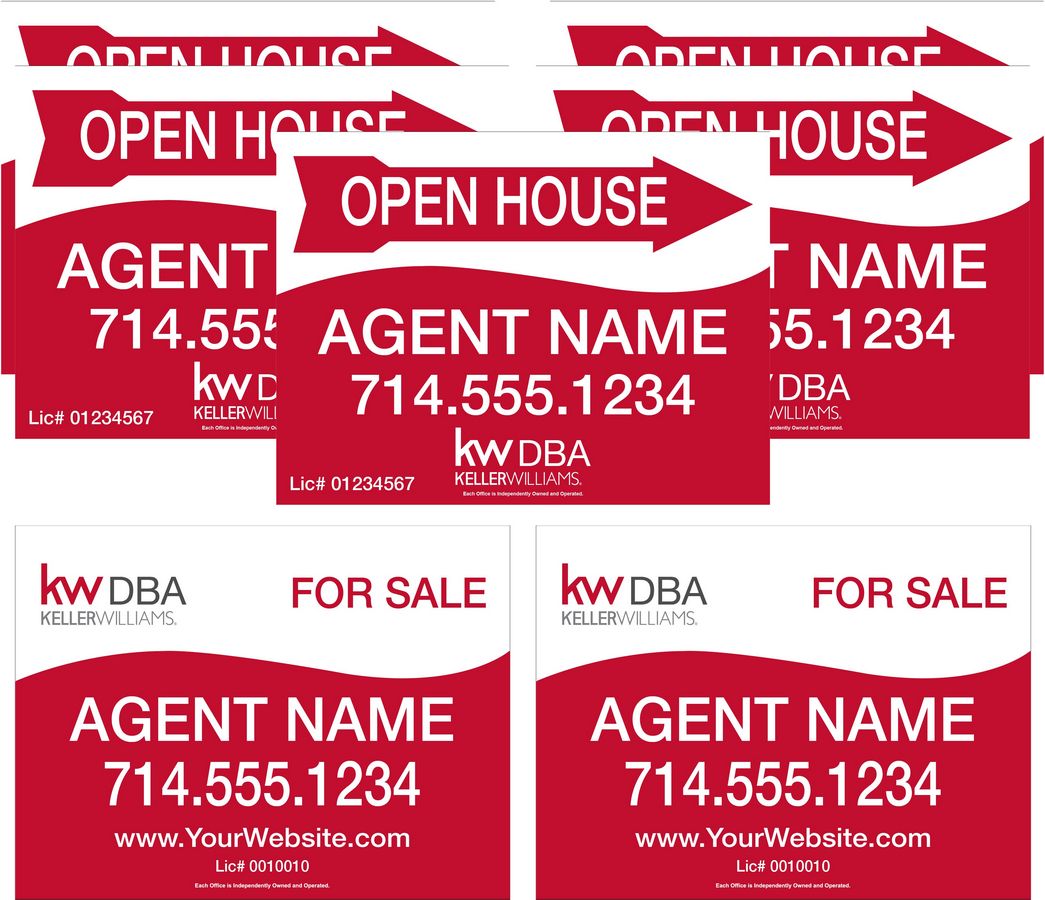 Ideal for a new realtor! 2 18x24" PVC or Polystyrene Listing Signs, drilled to your specification. 5 18x24" 6mm Coroplast Open House Signs with stakes.