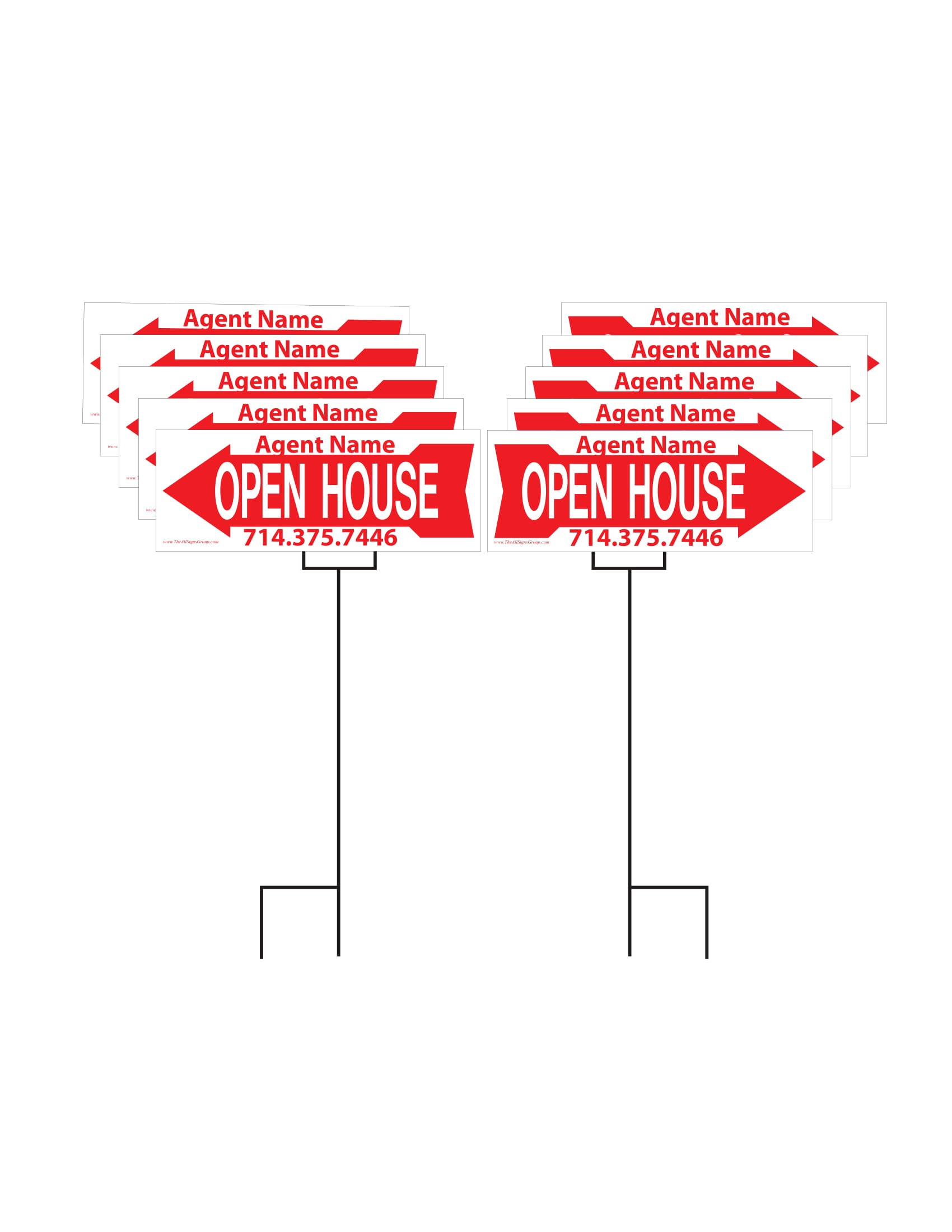 This is our best selling open house sign package! Includes ten 9x24" 6mm Coroplast Open House Signs with ten stakes.