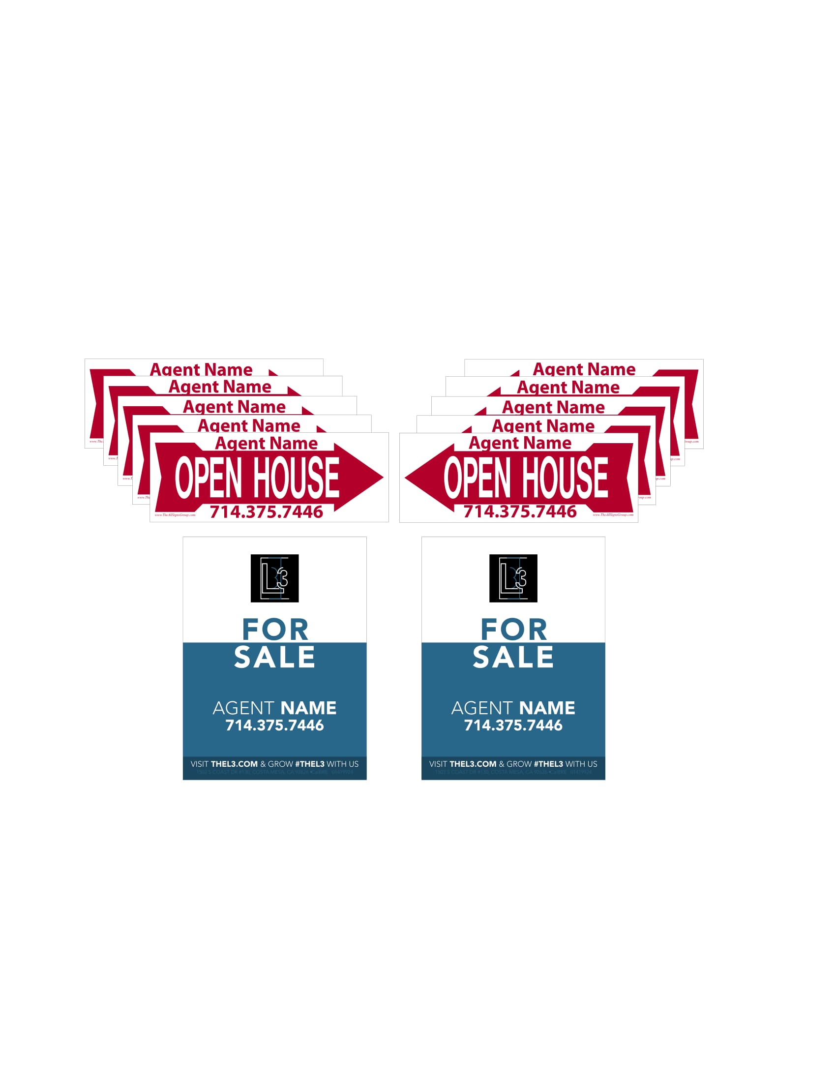 Ideal for a new realtor! 2 18x24" PVC or Polystyrene Listing Signs, drilled to your specifications. 10 9x24" 6mm Coroplast Open House Signs with ten stakes.