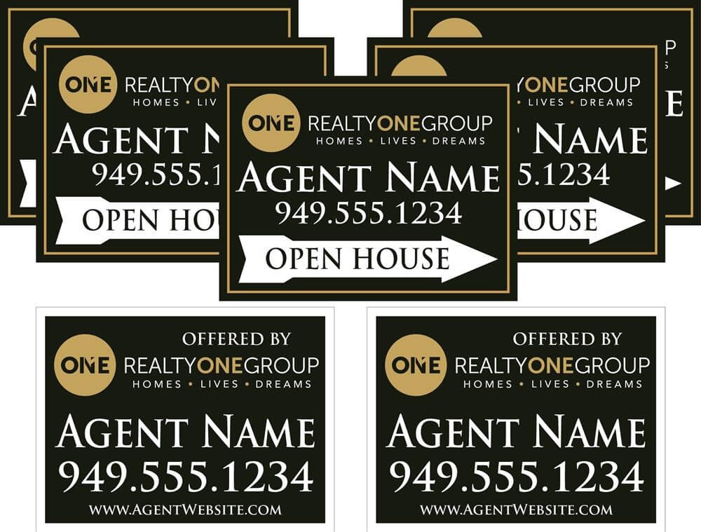 Ideal for a new realtor! 2 18x24" PVC or Polystyrene Listing Signs, drilled to your specification. 5 18x24" 6mm Coroplast Open House Signs with stakes.