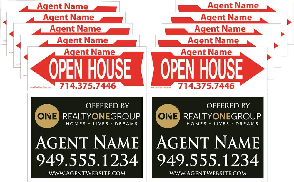 Ideal for a new realtor! 2 18x24" PVC or Polystyrene Listing Signs, drilled to your specifications. 10 9x24" 6mm Coroplast Open House Signs with ten stakes.