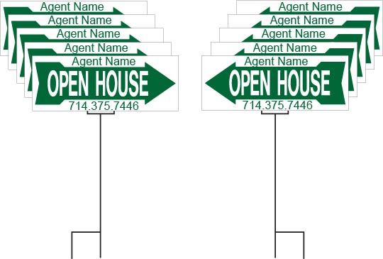 This is our best selling open house sign package! Includes ten 9x24" 6mm Coroplast Open House Signs with ten stakes.